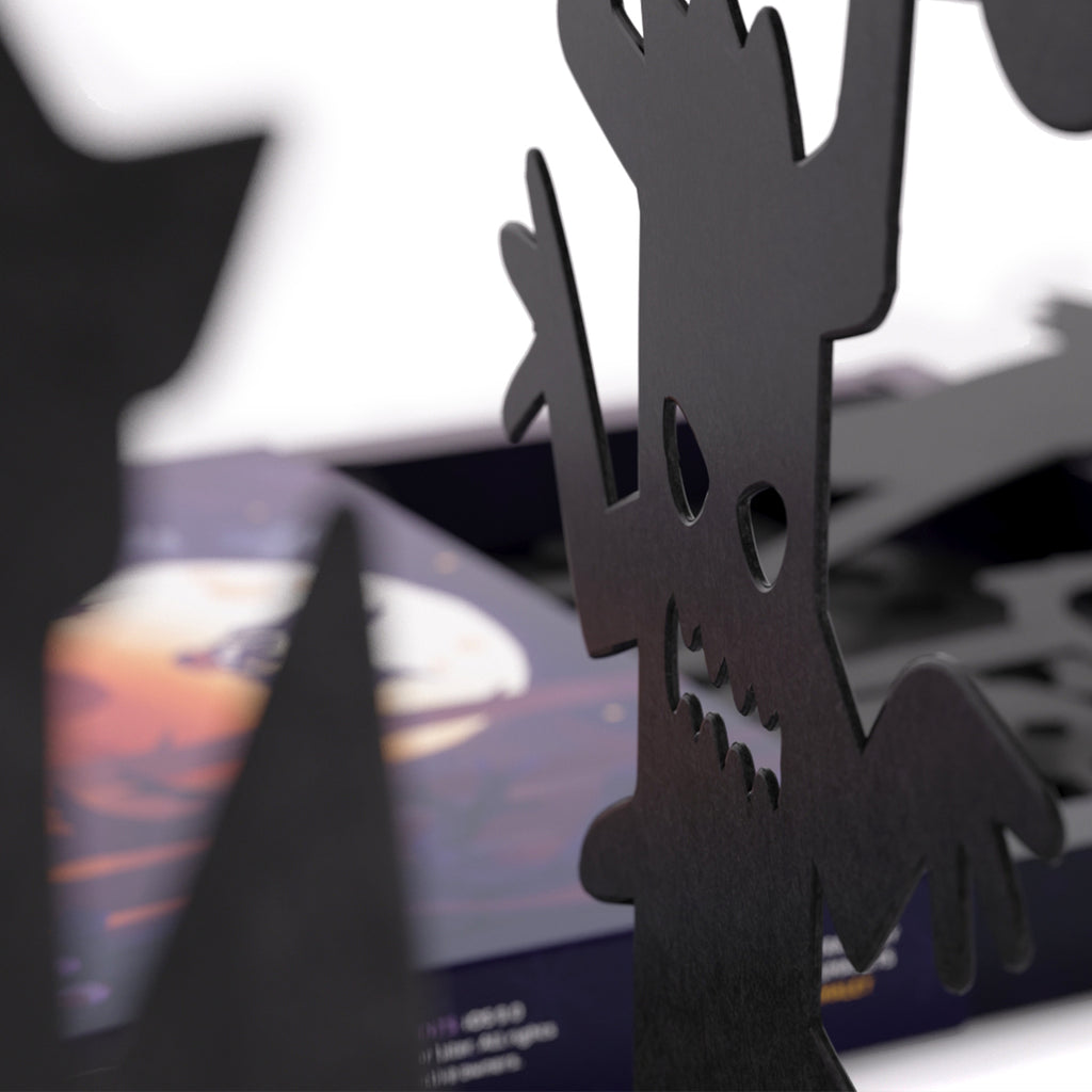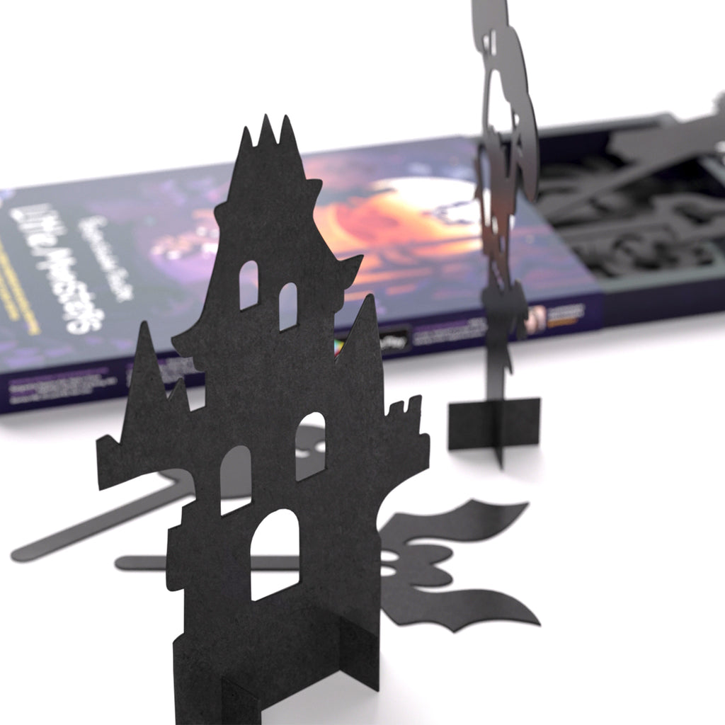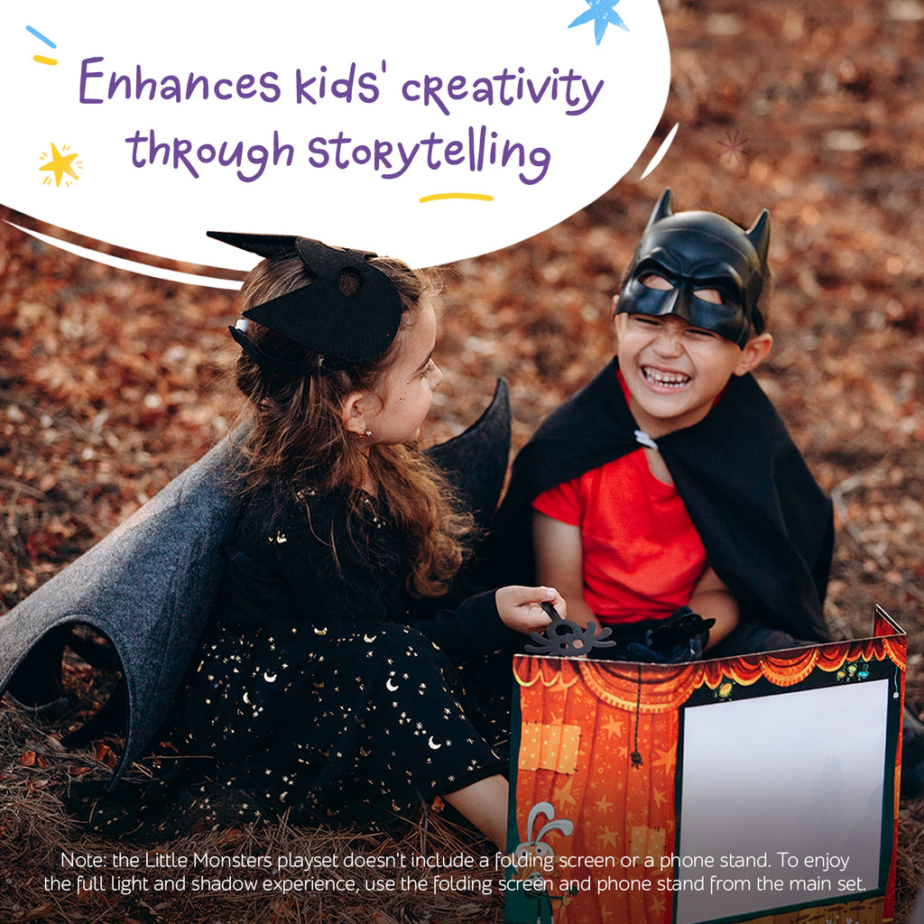 Note: the Little Monsters playset doesn't include a folding screen, a phone stand or a phone. To enjoy the full light and shadow experience, use the folding screen and phone stand from the main Papaton Theater main set.